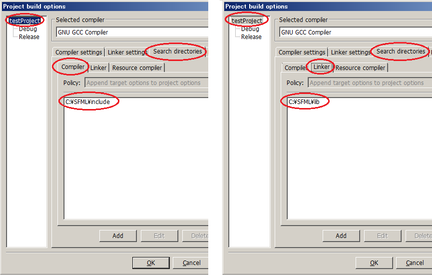 SFML のヘッダーさんたちの居場所( [SFML を設置したパス]/include)を "Compiler" のところに 追加(Add)。